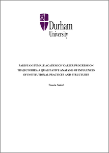 SADAF, FOUZIA (2022) PAKISTANI FEMALE ACADEMICS’ CAREER PROGRESSION TRAJECTORIES: A QUALITATIVE ANALYSIS OF INFLUENCES OF INSTITUTIONAL PRACTICES AND STRUCTURES. Doctoral thesis, Durham University.
