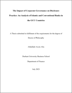 ABU, ABDULLAHI,AWEIS (2023) The Impact of Corporate Governance on Disclosure Practice: An Analysis of Islamic and Conventional Banks in the GCC Countries. Doctoral thesis, Durham University.