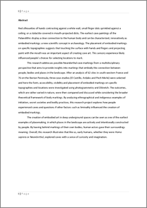 Red silhouettes of hands contrasting against a white wall, small finger dots sprinkled against a ceiling, or a stalactite covered in mouth-projected disks. The earliest cave paintings of the Palaeolithic display a clear connection to the human body and can be characterized, innovatively as embodied markings: a new scientific concept in archaeology. The placement of embodied markings on specific topographies suggests that touching the surface with hands and fingers and projecting paint with the mouth was an important aspect of creating cave art. This sensory experience likely influenced people’s choices for selecting locations to mark.