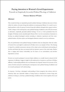 In response, I develop a theological understanding of these categories that reckons with the relational, finite and vulnerable realities of being human as described by women living with addiction. In doing so, I develop a political theology of addiction that is better capable of love and justice.