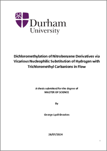 LYALL-BROOKES, GEORGE,ALASTAIR (2024) Dichloromethylation of Nitrobenzene Derivatives via Vicarious Nucleophilic Substitution of Hydrogen with Trichloromethyl Carbanions in Flow. Masters thesis, Durham University.