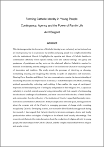 This thesis argues that the formation of Catholic identity is not exclusively an institutional nor an innate process, but is co-produced by families and young people in a complex relationship with the institutional Church. It highlights the expertise and labour of Catholic families to contextualise catholicity within specific family, social and cultural settings; the agency and persistence of participants as they seek out the relational, affective Catholicity required to maintain their identity; and the ambiguous role of the institutional Church in balancing forces of innovation and tradition. The study reveals the processes of inheriting or choosing, normalising, enacting and imagining this identity in cycles of adaptation and innovation. Drawing Pierre Bourdieu and Robert Orsi into conversation to examine the interrelationship of structuring structures and improvisation in the data, I sketch three styles of Catholic parenting: spiritual apprenticeship, enforcing, and enabling. I then outline the range of participants’ responses and the surprising role of ambiguity and paradox in their religious lives. A capacious catholicity is revealed, centred around a loving relationship with God, capable of withstanding