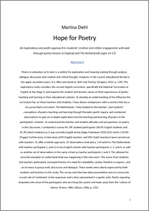 DIEHL, MARTINA (2025) Hope for Poetry: An exploratory and poetic approach to students' creative and critical engagement with and through poetry lessons in England and The Netherlands (ages 14-17). Doctoral thesis, Durham University.