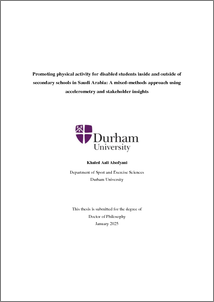 ALSOFYANI, KHALED,AALI,M (2025) Promoting physical activity for disabled students inside and outside of secondary schools in Saudi Arabia: A mixed-methods approach using accelerometry and stakeholder insights. Doctoral thesis, Durham University.