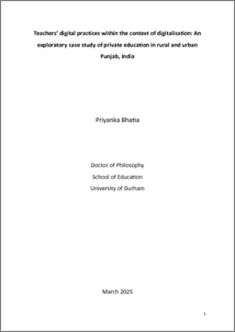 BHATIA, PRIYANKA (2025) Teachers’ digital practices within the context of digitalisation: An exploratory case study of private education in rural and urban Punjab, India. Doctoral thesis, Durham University.