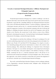 Formal theological education in Paraguay faces a number of challenges: some that are inherent to the broader context and others that emerge from its specific nature and environment. In particular, I argue that three outstanding challenges face Paraguayan theological education in the context of the Mennonite Brethren churches: a restrictive pedagogy, a fragmented vision of theological education and the lack of a contextual educational model. These challenges require the engagement of members of the educational community in the task of reflecting and thinking (or rethinking) theological education from and for the Paraguayan context and the churches served. Therefore, this research aims To offer reflective resources from a biblical, theological, and pedagogical perspective, fostering theological and pedagogical imagination in the pursuit of developing a contextual theological education.