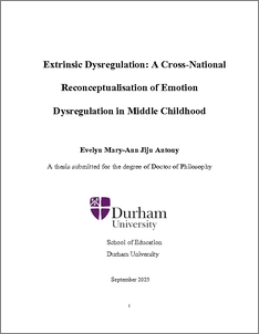 ANTONY, EVELYN,MARY-ANN,JIJU (2025) Extrinsic Dysregulation: A Cross-National Reconceptualisation of Emotion Dysregulation in Middle Childhood. Doctoral thesis, Durham University.