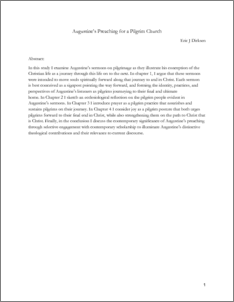 In this study I examine Augustine’s sermons on pilgrimage as they illustrate his conception of the Christian life as a journey through this life on to the next. In chapter 1, I argue that these sermons were intended to move souls spiritually forward along that journey to and in Christ. Each sermon is best conceived as a signpost pointing the way forward, and forming the identity, practices, and perspectives of Augustine’s listeners as pilgrims journeying to their final and ultimate home. In Chapter 2 I sketch an ecclesiological reflection on the pilgrim people evident in Augustine’s sermons. In Chapter 3 I introduce prayer as a pilgrim practice that nourishes and sustains pilgrims on their journey. In Chapter 4 I consider joy as a pilgrim posture that both urges pilgrims forward to their final end in Christ, while also strengthening them on the path to Christ that is Christ. Finally, in the conclusion I discuss the contemporary significance of Augustine’s preaching through selective engagement with contemporary scholarship to illuminate Augustine’s distinctive theological contributions and their relevance to current discourse.
