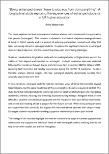 To do so, I conducted a longitudinal study with ten undergraduates in England who were in the middle of their degree and identified as estranged. In-depth qualitative data was collected following their narratives through diaries and interviews from December 2020 to October 2021, capturing both term-time and holiday experiences during the COVID-19 pandemic. Iterative thematic analysis offered insights into how estranged students dynamically narrated their university experiences over time.